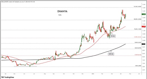 Dhaniya trading range for the day is 12642-13594.