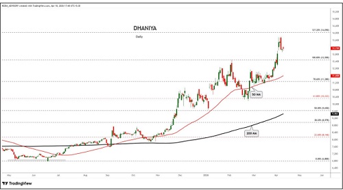 Dhaniya dropped on profit booking as arrivals in major hubs have accelerated after fiscal year-end activities in late March.