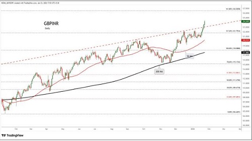 GBPINR trading range for the day is 123.71-124.59.