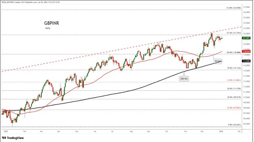 GBPINR trading range for the day is 121.39-122.99.