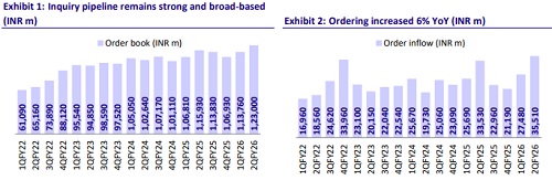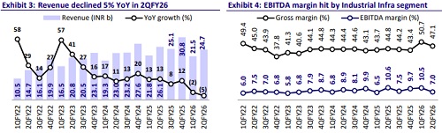 Revenue declined 5% YoY to INR24.7b (vs. our est. INR28.9b), primarily driven by a 24% YoY decline in the Industrial Infra segment. Gross margin expanded ~230bp YoY but contracted ~360bp QoQ to 47.1%. Lower margins in the Industrial Infra division led to an overall EBITDA margin contraction of ~360bp YoY to 7.0%, with EBITDA at INR1.7b (-38% YoY), missing our estimate by 38%. The decline in profitability was impacted by project cost overruns in the Industrial Infra segment and a higher-than-expected tax rate, resulting in an adjusted PAT of INR1.2b (-40% YoY, 33% below our estimate), while PAT margin contracted 280bp YoY to 4.8%. Order inflows for the quarter stood at INR35.5b, up 6% YoY, taking the total order book to INR123b, up 6% YoY. For 1HFY26, revenue/EBITDA/PAT declined 4%/5%/12% YoY to INR46.2b/INR4.0b/INR2.7b, with margins contracting marginally by 10bp YoY to 8.6%. For 1HFY26, OCF declined by 88% to INR0.6b and FCF outflow was INR3.3b vs. INR0.2b in 1HFY25.