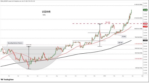 USDINR trading range for the day is 93.25-96.57.
