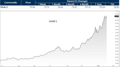 The macroeconomic environment remains mixed but medium-term supportive for silver, underpinned by elevated debt levels and constrained policy flexibility. US Treasury yields have moved higher, with the 10-year yield rising to ~4.23%, the highest level in over four months, supported by resilient macro data—industrial production and retail sales both exceeded expectations—and renewed uncertainty around the future independence and leadership of the Federal Reserve.