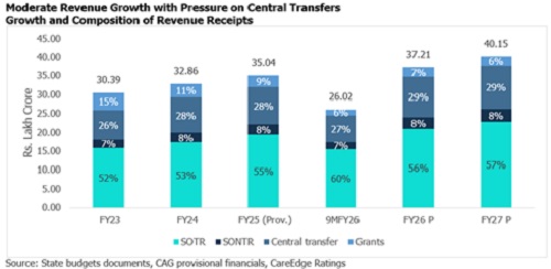 CareEdge Ratings expect revenue expenditure to remain high, driven by sustained growth in social sector spending and welfare-oriented measures alongside potential pressures from higher energy and commodity costs, leading to a gradual widening of revenue deficits and limiting fiscal flexibility.