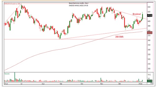 * BEL has registered a fresh upside breakout, with prices rebounding decisively from the recent consolidation phase, indicating a constructive technical setup.