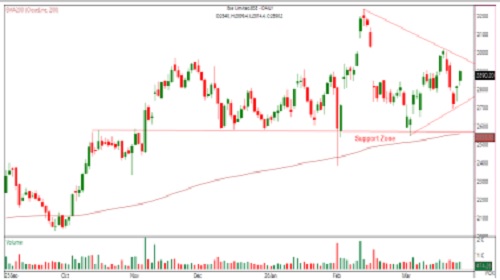 * A breakout from a symmetrical triangle pattern indicates potential trend continuation, supported by a sequence of higher lows and consistent demand near the support zone.