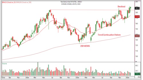 * Tata Steel’s price structure indicates a strengthening bullish bias, showing constant higher highs and higher low formation.