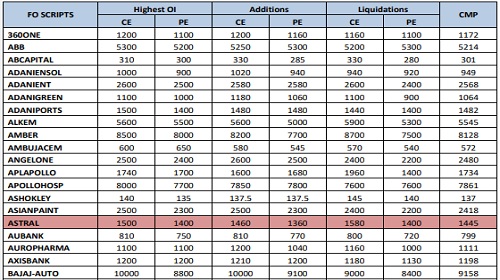 * E.g. – If ASIANPAINT saw Highest OI Addition at 2700 CE strike and Liquidation at 2600 CE strike; it means that the stock can witness a breakout of 2600 as writers are moving higher and stock can move towards 2700. Alternatively if the Highest OI Addition if at 2400 CE strike and Liquidation at 2600 CE strike; it means that the stock can witness selling and move towards 2400 levels as writers are writing lower strike CE’s.