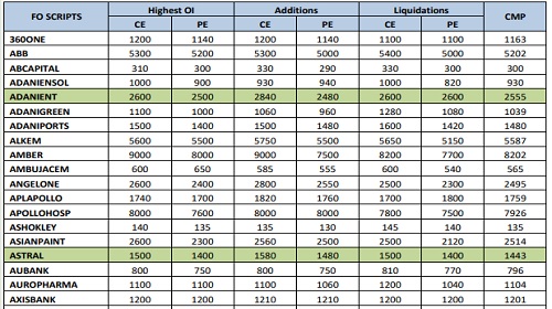 * E.g. – If ASIANPAINT saw Highest OI Addition at 2700 CE strike and Liquidation at 2600 CE strike; it means that the stock can witness a breakout of 2600 as writers are moving higher and stock can move towards 2700. Alternatively if the Highest OI Addition if at 2400 CE strike and Liquidation at 2600 CE strike; it means that the stock can witness selling and move towards 2400 levels as writers are writing lower strike CE’s.