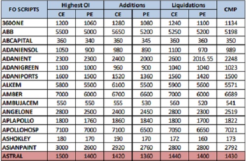 * E.g. – If ASIANPAINT saw Highest OI Addition at 2700 CE strike and Liquidation at 2600 CE strike; it means that the stock can witness a breakout of 2600 as writers are moving higher and stock can move towards 2700. Alternatively if the Highest OI Addition if at 2400 CE strike and Liquidation at 2600 CE strike; it means that the stock can witness selling and move towards 2400 levels as writers are writing lower strike CE’s.
