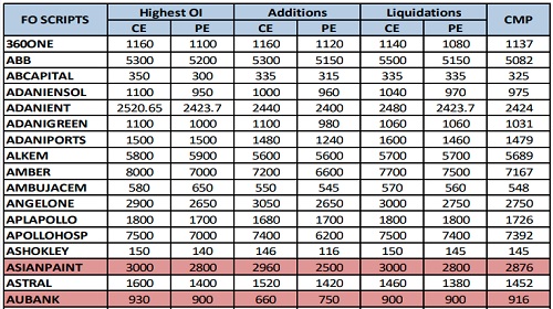 * E.g. – If ASIANPAINT saw Highest OI Addition at 2700 CE strike and Liquidation at 2600 CE strike; it means that the stock can witness a breakout of 2600 as writers are moving higher and stock can move towards 2700. Alternatively if the Highest OI Addition if at 2400 CE strike and Liquidation at 2600 CE strike; it means that the stock can witness selling and move towards 2400 levels as writers are writing lower strike CE’s.