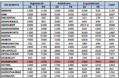 * E.g. – If ASIANPAINT saw Highest OI Addition at 2300 PE strike and Liquidation in 2400 PE Strikes; it means that the stock can witness a breakdown of 2400 and move towards 2300 as writers are writing lower strikes in fear of further selling in stock. Alternatively if the Highest OI Addition if at 2600 PE strike and Liquidation in 2400 PE Strike; it means that the stock can witness buying and move towards 2600 levels as writers feel confident of a rise in stock and hence are writing higher strike Puts.