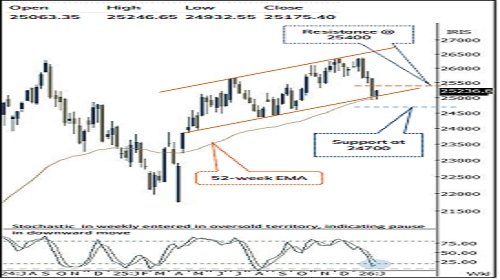 * Key point to highlight is that index is missing a follow-through strength above its previous session high on closing basis since 5th Jan 2026, thereby a decisive close with a follow through strength above previous session high would confirm pause in current downward momentum and help index to gradually head towards previous swing high of 25,400.
