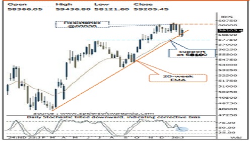 * We believe, follow through strength above todays high (59437) would trigger further upsides towards 60000 levels. On the downside strong support is placed at 58100 being 100-day EMA.