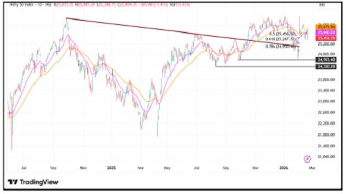 The Nifty index opened on a positive note but gradually drifted lower throughout the session, ultimately erasing the gains of the past three days. As a result, it formed a large bearish candlestick on the daily chart and closed below its 20- and 50-DEMA, signaling weakening short-term momentum. The decline was largely attributed to escalating tensions between the US and Iran, which dampened risk appetite and reflected cautious near-term sentiment in the market. On the sectoral front, Realty and Media stocks emerged as the major laggards, ending the session as the top losers.