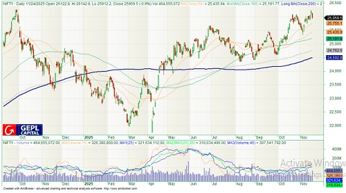 Resistance:26150 (Multiple Touches) and 26300 (Key Resistance). Support: 25800 (Pivot Level) and 25500 (Key Support).