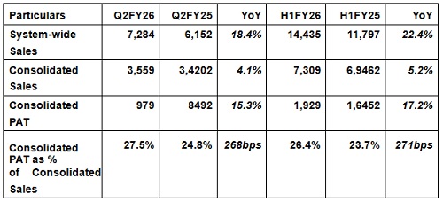 Strong system-wide sales growth of 18.4% YoY along with an increase in consolidated PAT to Rs.979 million in Q2FY26, up 15.3% YoY on an adjusted basis
