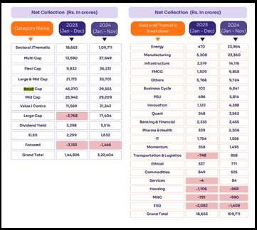 The Net Collections under Large caps stood at Rs. 17,404 crores in 2024 compared to Rs. -3,768 crores in 2023. Net Collections under Multi caps & Flexicap stood at Rs. 37,649 crores & Rs. 36,231 crores, respectively in CY 2024.