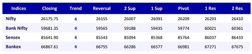 Nifty once again after witnessing a positive opening session found resistance near the 26300 zone and fizzled out gradually as the day progressed and closed near the 26200 zone with bias maintained intact having the important support near the 25750-25800 band which needs to be sustained. With a revival expected, the index can carry on with the positive move with 26000 level positioned as the near-term support and, on the upside, can have fresh targets of 26500 and 27200 levels in the coming days. Sensex has once again found resistance near the 86100 zone in the opening session and thereafter, has witnessed a gradual slide with profit booking seen to erode the gains and close near the 85650 zone with a marginal loss. With the undertone maintained strong, the index can carry on with the positive move further ahead with higher targets of 87400 and 89000 levels expected in the coming days, as we had been mentioning earlier. The index would need to sustain the important near-term support zone of 84500 level, and a revival shall establish conviction to anticipate for further gains. The support for the day is seen at 26100 levels, while the resistance is seen at 26400 levels.