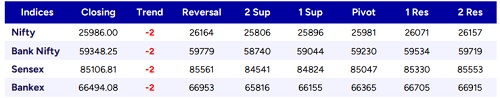 Nifty witnessed a slight volatile session taking support near the 25900 zone during the intraday session with bias slightly maintained with a cautiously positive approach and has the important near-term support near the 25770-25800 band which needs to be sustained to maintain the positive bias intact. As mentioned earlier, once a stability is established near the 25800 zone, we can expect for further revival to carry on with the positive trend further ahead. Sensex after witnessing a weak opening consolidated near the 84800 zone and recovered to some extent in the final hours to erase the losses to end almost on a flat note. As mentioned earlier, the index would have the near term support at 84400 zone which needs to be sustained and only with a revival established can expect the index to continue with the upward move having fresh higher targets of 87400 and 89000 levels in the coming days. The support for the day is seen at 25800 levels, while the resistance is seen at 26200 levels.