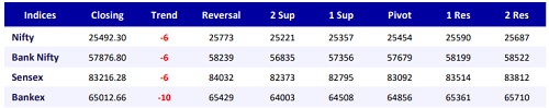 Nifty after witnessing a weak morning session, recovered strongly after hitting the low near the important 50EMA at 25320 zone to overall improve the sentiment and bias expecting to carry on with the same optimistic approach in the coming sessions. The index would need to move past the 25750 zone to improve the bias and establish conviction for further rise having targets of 26100 and 26500 levels expected. With the broader markets also recovering significantly and with support maintained near the 25300 level we expect further gains for the index. Sensex after witnessing a short period of correction has shown signs of taking support near the important 50EMA at 82700 level and with a recovery visible has slightly improved the bias to anticipate for further continuation of the upward move in the coming sessions. The index would need to move past the near-term resistance of 84000 zone to overall improve the bias and expect for further rise with conviction. The index would have the important near-term support at 100 period MA at 82100 level.. The support for the day is seen at 25350 levels, while the resistance is seen at 25700 levels.