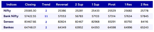 Nifty continued with the strong, robust move further ahead, indicating a breakout above the resistance zone of the 25500 level, with bias gaining strength, expecting a further upward move in the coming days. With the undertone getting strong, the index would have the next target of the 27800 zone, above which the trend would turn bullish to retest the previous peak zone of the 26300 level with the important support positioned at the 25000 level from here on. Sensex indicated a strong bullish candle on the daily chart. The overall sentiment of the market players closed on a strong note near the 83500 level to anticipate a further rise in the coming days. The index has gained strength, with most of the frontline stocks indicating a positive revival to expect further gains, and once the recent peak of the 84000 zone is breached decisively, one can expect fresh targets of the 86000 and 86500 levels in the coming days. The support for the day is seen at 25450 levels, while the resistance is seen at 25800 levels