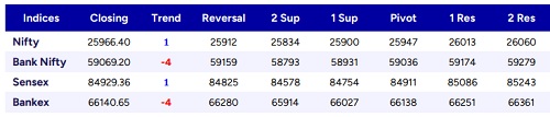 Bank Nifty witnessed a range-bound session with the 59000 zone sustained and closed in the green with a 156-point gain, indicating some hopes. The index has got the important 50EMA at the 58351 level, which would be the next near-term support zone, and, on the upside, a decisive breach above the 59500 level would improve the bias; thereafter, expect further rise. Bankex continues to witness a sluggish and narrow range-bound session overall, indicating a gradual rise in the last few sessions but lacking conviction and a clear directional move. As we have been mentioning, the index would need a decisive move past the 66700 zone to overall improve the bias, and thereafter, establish conviction anticipating a fresh upward move in the coming days with the 65800 level maintained as the important support zone, which needs to be sustained. Bank Nifty would have the daily range of 58500-59500 levels.