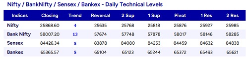 Nifty surged ahead with a strong opening session above the 25900 zone with the overall trend getting strong and is aiming to retest the previous peak zone of the 26300 level in the coming days. The index would have the important support positioned near the trendline zone at the 25400 level, which needs to be sustained to keep the bias intact, and currently, with the undertone being strong, we can expect further gains in the coming days. Sensex continues to gain strength, sustaining above the important 161.8% retracement level, which is positioned near the 83750 zone, maintained as the strong near-term support, and currently closing above the 84000 level has further improved bias and sentiment overall. With the broader markets supporting the benchmark index, on the upside, Sensex needs to breach above the important previous high level of the 86000 zone, which shall establish further stability and conviction for further upward movement towards 89500–93800 in the coming days. The support for the day is seen at 25700 levels, while the resistance is seen at 26000 levels.