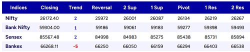 Bank Nifty extended the gains from the previous session, closing near the 59300 zone with bias improving, and we can expect a further rise in the coming days once a decisive breach above the 60000 zone is confirmed to establish conviction. With the trend maintained positive and sentiment overall improving, we can anticipate a further upward move, having targets of 61300 and 62700 levels in the coming days, with major support positioned near the 50EMA level at the 58500 zone. Bankex, after opening on a positive note, remained almost stagnant with narrow range movement to close in the green near the 66260 zone, with bias precariously placed, anxiously anticipating a pullback in the coming sessions. As said earlier, with the major support zone lying near the 50 EMA level of 65500, the index would need to breach above the level of the 67000 zone to establish conviction and expect a further rise in the coming days. Bank Nifty would have the daily range of 59000-59800 levels.