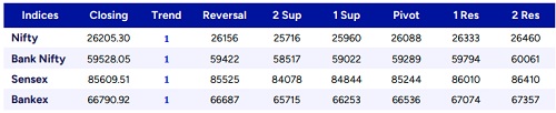 Nifty witnessed a strong and convincing turnaround from the 25850 zone with a huge bullish engulfing candle to indicate a strong optimistic closing at the 26200 level, accompanied by a robust move from the broader markets to ease out the sentiment and to anticipate a further rise in the coming days. The index would have the important support near the 25750-25800 band, which needs to be sustained, and on the upside, with the undertone going strong, one can expect fresh higher targets of 26500 and 27200 levels in the coming days, as mentioned earlier. Sensex witnessed a strong recovery from the 20DMA zone during the intraday session with a steady gain as the day progressed and ended on a quite optimistic note above the 85600 level, expecting a further rise in the coming sessions. A decisive close above the 85800 zone would be important for the index, which can boost the sentiment and anticipate the next target of the 87000 level, with the current 84500 level as the major and crucial support that needs to be sustained, as mentioned earlier. The support for the day is seen at 26100 levels, while the resistance is seen at 26400 levels.