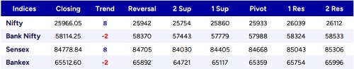 Nifty once again recovered significantly to scale the 26000 zone after witnessing two weak sessions to take a breather, and with bias turning positive, it has improved the sentiment to anticipate a further rise in the coming days. As mentioned earlier, the index maintaining a strong uptrend has the next initial target of the 26500 level, and thereafter, with sustained strength, we can expect a higher target of the 27300 level, with the 25400 zone positioned as the important support from the current level. Sensex has regained strength after witnessing two sessions of profit booking and has closed near the 84700 level once again, expecting further rise in the coming sessions. With the undertone maintained positive along with the broader markets indicating active participation, the index is maintained positive, and as mentioned earlier, once the level of 85300 is breached decisively, we can anticipate higher targets of the 89500 (1.28% retracement) and 93793 (1.61% retracement) levels in the coming days. The important and crucial support zone would be positioned near the 83000 level as mentioned earlier, which needs to be sustained. The support for the day is seen at 25800 levels, while the resistance is seen at 26200 levels.
