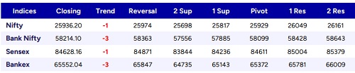 Nifty witnessed a volatile session, finding resistance near the 26000 zone, and amid fluctuations hit the low of the 25800 level on the monthly expiry day to finally close near the 25950 level with bias maintained with a cautiously positive approach. As mentioned earlier, the index having the important support positioned near the 25400 zone would need a decisive breach above the 26000 zone to trigger a fresh upward move having near-term targets of 26300 and 26700 levels in the coming days. Sensex witnessed a highly volatile session, swinging both ways, finding resistance near the 85000 zone, and thereafter, showing good support near the 84200 level to close near the 84600 level, with bias overall maintained with a cautious approach. As mentioned earlier, the index is precariously placed, having the crucial and major support positioned near the 83700 zone, and on the upside, it would need a convincing and decisive breach above the 85200 zone to expect further upside movement in the coming days. The support for the day is seen at 25800 levels, while the resistance is seen at 26200 levels.