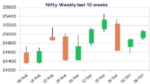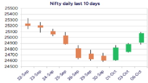 Nifty, continued with the positive move further ahead with a bullish candle formation on the daily chart moving past the significant 50EMA at 24900 zone decisively to improve the bias and closed the session above the 25000 level which was important with respect to sentiment which is beginning to turn optimistic from here on. The index, as mentioned earlier, a decisive move above the near-term hurdle of 25250 level shall further establish conviction and clarity to anticipate for further rise in the coming days with next target of 25700 level achievable. BankNifty, witnessed a robust move to close above the 56000-zone indicating a breakout above the neckline of the Inverted Head & Shoulder pattern at 55700 level to improve the bias and trigger for fresh upward move having targets of 57700 and 58500 levels in the coming days. The RSI is on the rise indicating strength and with the bias and sentiment getting better in the last 3 sessions, one can anticipate for further gains soon, with 55000 zone positioned as the near-term support