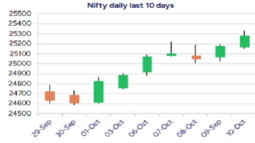 Nifty has continued with the positive move gaining further crossing the 25300 zone during the intraday with bias and sentiment improving once again with the broader markets showing signs of positive move anticipating for further rise in the coming days. The index would need a decisive close above the important hurdle at 25300 zone to establish conviction and thereafter, can expect for fresh upward move with 25700 level as the next immediate target