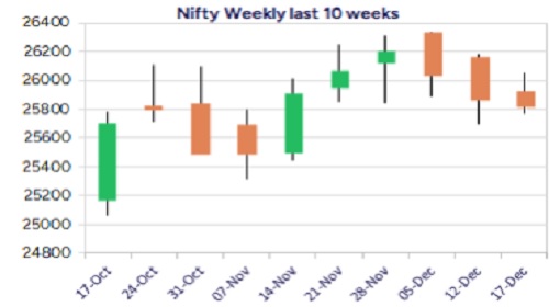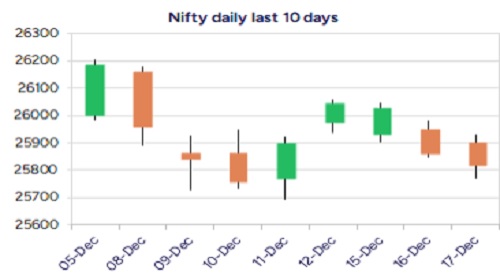 Nifty witnessed a sluggish session with a narrow range-bound movement, just managing to sustain above the 50EMA level of the 25770 zone, with the bias remaining cautious. BankNifty was gripped within a narrow range between the 59100 and 58800 zones with no clear direction as of now, with bias and sentiment precariously placed. The market breadth ended on a weak note, with the advance decline indicating a ratio of 1:2 at close.