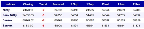 Nifty, once again witnessed a sluggish session on the expiry day with a rangebound movement gripped between the 24700 and 24600 zone for the entire session to end almost on a flat note. With the bias overall maintained with a cautious approach, the index is precariously placed having the crucial and major support positioned near the 24450-24500 zone, as mentioned earlier, and on the upside, would desperately need a decisive breach above the 24900 zone to expect for further upside movement in the coming days. Sensex after sliding heavily since the last 7 sessions, it witnessed a narrow rangebound session with bias maintained with a cautious approach having the important and crucial support at the 200 period SMA at 79500 zone which needs to be sustained. As mentioned earlier, for the bias to improve, it would need to cross the 50EMA at 81400 zone and thereafter expect for further rise in the coming days. The support for the day is seen at 24500 levels, while the resistance is seen at 24800 levels.