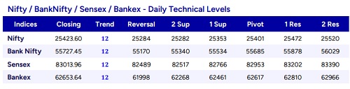Nifty opened on a strong note with a gap up near the 25400 zone and, amid some volatility post-lunch session, witnessed a last-hour recovery to end on an optimistic note above the 25400 zone with further gains anticipated in the coming days. The index, if it crosses the 25500 level, shall further strengthen the trend, expecting a fresh upward move with conviction, having targets of 25700 and 26300 levels in the coming days. The 50EMA level at the 24900 zone shall be the important support from the current level, which needs to be sustained. Sensex, maintaining the positive bias intact, has witnessed a gradual rise in the last 3 sessions, and closing above the hurdle of the 82920 (1.28% retracement) zone has improved the bias further, with overall sentiment maintained with a cautiously positive approach as of now. The index would be aiming for the near-term target of the 83750 zone, which, if decisively breached above, can achieve the next upside target of the 86000 level, with the currently important 50EMA at the 81400 level positioned as the crucial support zone. The support for the day is seen at 25300 levels, while the resistance is seen at 25600 levels.