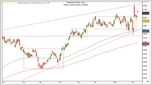 * Immediate resistance is observed near 61,500, with support around 59,600 levels in the near term.
