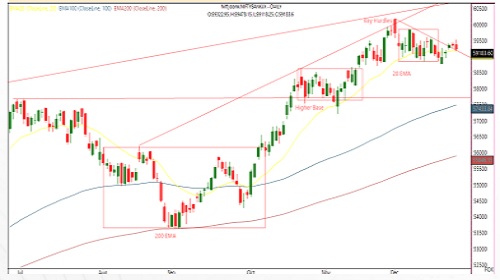 * For fresh momentum, the banking index will need a decisive breakout above the 59,500 level. Until then, we may see 1,000-point trading band of 58,800–59,800 remain intact.