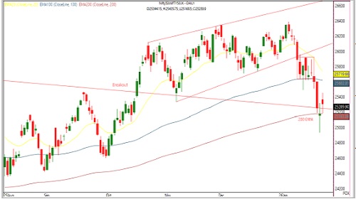 * From a technical perspective, the Nifty is hovering around its long-term moving average, the 200-day DEMA near the 25,150 level.
