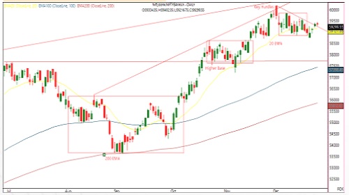 * Despite the underlying positive tone, the index continues to remain confined within a 1,000-point trading range of 58,800–59,800. For fresh upside momentum, a decisive breakout above 59,500 is required.
