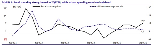 * Our rural demand tracker shows that rural consumption has been on a steady uptrend since 2HFY25, strengthening further in 2QFY26 (up 7.7% YoY) to its highest level in 17 quarters.