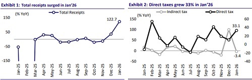 * As a result of restrained spending and better direct tax performance, the fiscal deficit narrowed sharply by 50.8% YoY in Jan’26.