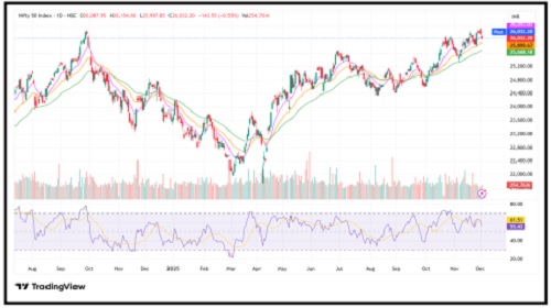 The index opened on a positive note but gradually drifted lower, forming a sequence of lower tops and lower bottoms. This continuation of the prior day’s weakness highlights the absence of strong bullish momentum and reflects a cautious undertone in the market. On the sectoral front, the PSU Bank index emerged as the top gainer, demonstrating notable relative strength despite broad-market softness. Meanwhile, the Capital Market and Defence sectors were the major laggards, witnessing profit-booking and underperformance throughout the session.