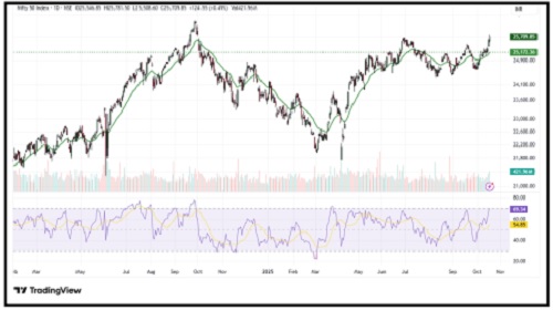 The index extended its previous session’s winning streak and successfully breached the key 25,750 resistance level during the first half of the intraday session, marking a new day high at 25,781. However, profit booking emerged near the classic pivot R2 level, leading the index to halt around the prior day’s high. On the daily chart, the index had earlier registered a breakout above the neckline of a Cup and Handle pattern, and today’s session witnessed bullish follow- through, indicating that positive sentiment remains intact. On the sectoral front, FMCG and Consumption led the gains, while Media and IT sectors were the major laggards of the day.