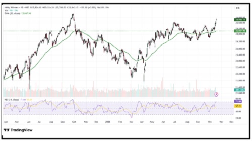 The index opened on a positive note with a gap-up, supported by easing tensions between the US and China. However, it traded within a narrow range throughout the intraday session. On the daily scale, the index continues to maintain its pattern of higher highs and higher lows, staying firmly above the 5, 12, and 26 DEMA, reflecting ongoing strength. The momentum indicator MACD remains in positive territory, confirming sustained bullish momentum. On the sectoral front, PSU Bank and Oil & Gas emerged as the top gainers, while Auto and Financial Services underperformed during the session.