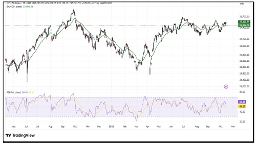 The index opened on a positive note, recovering from the previous day’s weakness and sustaining above the prior day’s high as well as the key resistance level of 25,300. It continues to trade above the 12-day and 26-day EMAs, reflecting strength and positive sentiment. On the sectoral front, realty and defence emerged as the top gainers, while media and oil & gas were the major laggards of the day.