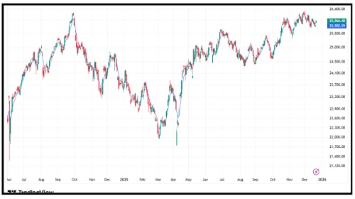 The index opened on a gap-up note and remained largely range-bound throughout the session, while comfortably sustaining above its 20-DEMA and 50-DEMA, indicating underlying stability. During the session, the index also broke out of a sloping trendline that had been capping prices and had led to a lower-top formation, signaling a potential shift towards a more positive near-term structure. This breakout suggests that selling pressure at higher levels is easing and that the index may be attempting to regain upward momentum. However, the lack of strong follow-through buying kept the price action confined to a narrow range, reflecting cautious optimism rather than aggressive bullishness. On the sectoral front, Defense and Realty stock outperformed and emerged as the top gainers for the day, while Metal and Capital Market stocks witnessed profit booking, indicating sectoral rotation rather than broad-based weakness.