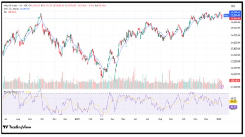 The index opened on a muted note and slipped below the prior day’s Doji low, confirming a decisive breakdown. The move was further aggravated as the index breached its key 26- and 50-day EMAs, along with a violation of the rising trendline, signaling a near-term trend breakdown and weak market sentiment. On the sectoral front, broadbased selling pressure was evident across most sectors, with Metal and IT stocks emerging as the major laggards for the session.