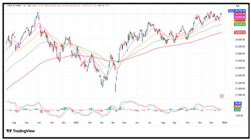 The index opened on a positive note but faced strong rejection near the crucial 26,200 resistance zone, leading to a gradual drift lower and a close below the previous day’s levels. The 26,200 mark continues to act as a formidable supply area, as it coincides with the maximum Call OI, indicating aggressive call writing and capped upside. Additionally, the 26,220 level represents the highest closing level of the past one year, further reinforcing this zone as a major hurdle for the index. On the sectoral front, Media and Realty stocks outperformed and provided relative support to the market, while Oil & Gas and Pharma sectors witnessed selling pressure and emerged as the top laggards for the session. Overall, the price action suggests cautious sentiment near key resistance, with traders awaiting a decisive breakout above the 26,200–26,220 zone for further directional clarity.